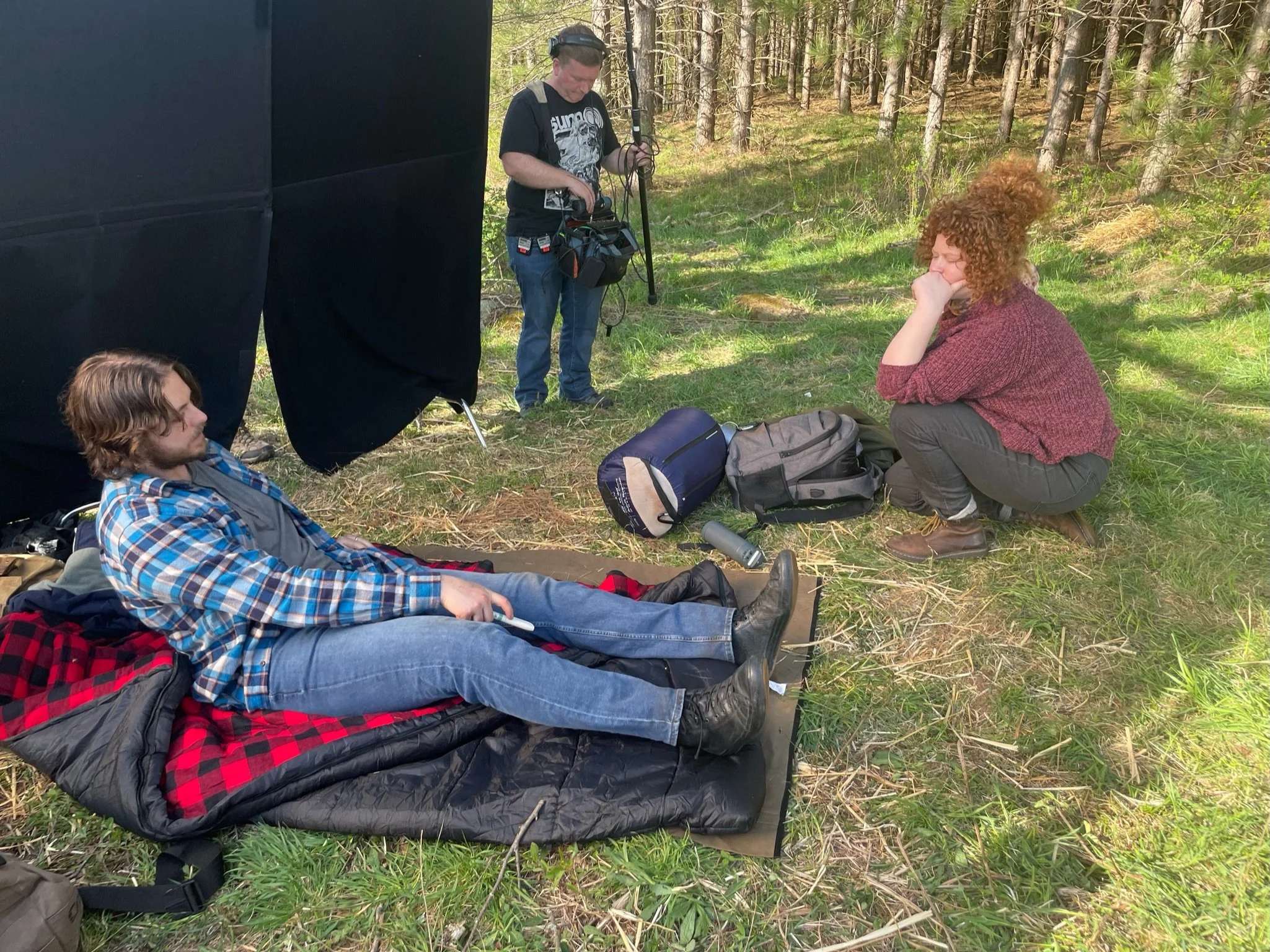 The story of the corpse had to be conveyed without any dialog. Micah and Laura discover her by accident as they journey through the woods. She is a young woman who has come from a nearby city and sought out a spot where she won’t be interrupted. Her look is soft and hopeful and ordinary. The pink coat is what gets the attention of the couple: that immediate primal feeling of danger when you see something out of the corner of your eye that shouldn’t be there. The scarf is meant to be used as a tourniquet based on research of young female addicts.